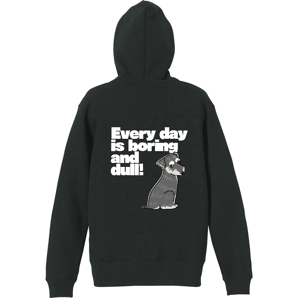 背中にモノクロのミニチュアシュナウザーのイラストが描かれたプルオーバーパーカーです。
