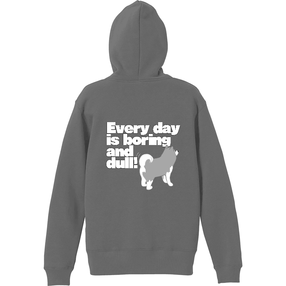 背中にモノクロの柴犬の後姿のイラストが描かれたプルオーバーパーカーです。