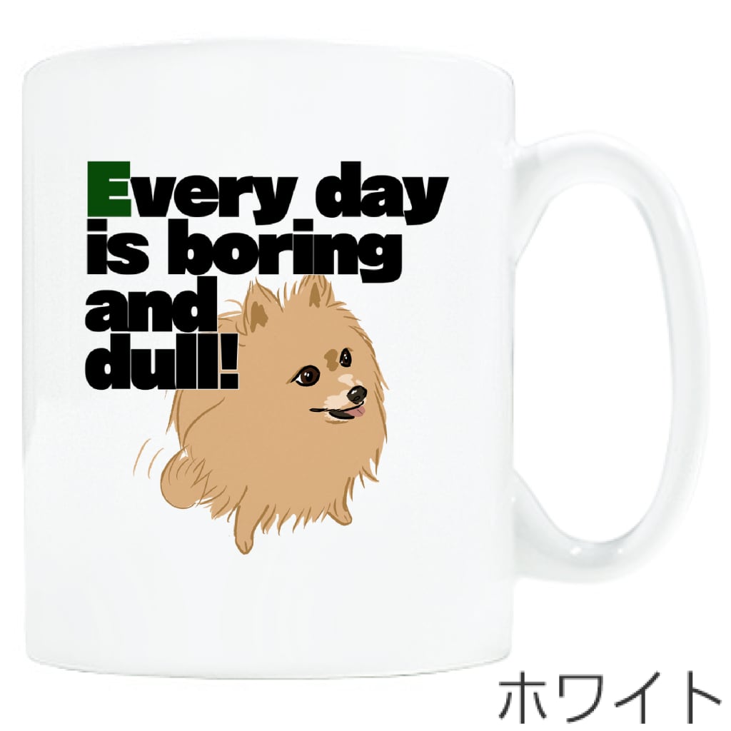 ポメラニアンのイラストが描かれた白いマグカップです。